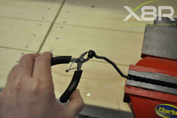 Recorte los arbustos de plástico vieja. Esto se puede hacer con cortadores de mano como se muestra o con una herramienta como una Dremel. Tenga cuidado al quitar las piezas de plástico que no se doble la varilla de operación. También se recomienda protección ocular para este paso.