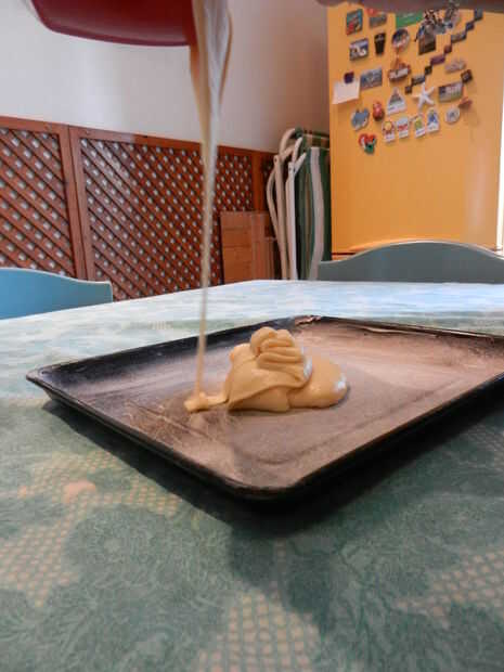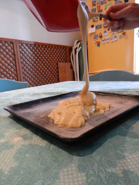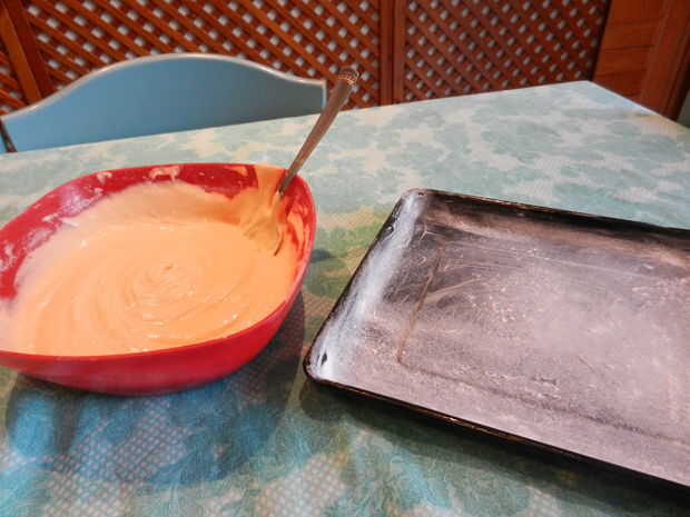 Lentamente bata la crema anterior. Cuando pat y liso, uniformemente en la parte inferior de con mantequilla y enharinado hornear de 8 por 16 pulgadas.
