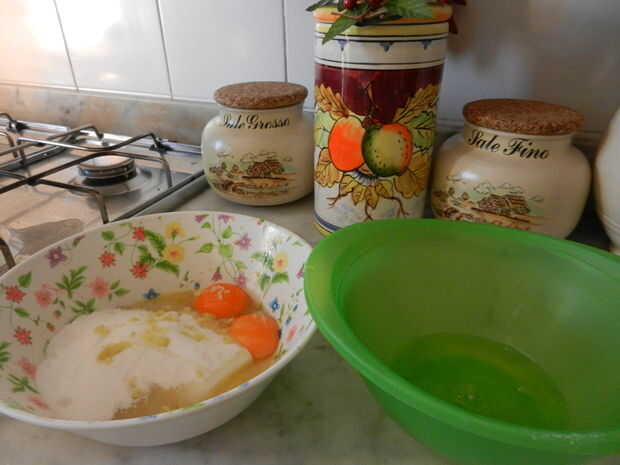 Batir 4 huevos blancos hasta lo suficientemente dura como para mantener un pico.