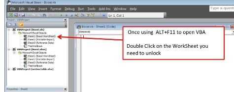 Una vez en VBA haga doble clic en la hoja que se necesita para desbloquear en el menú listado a la izquierda.