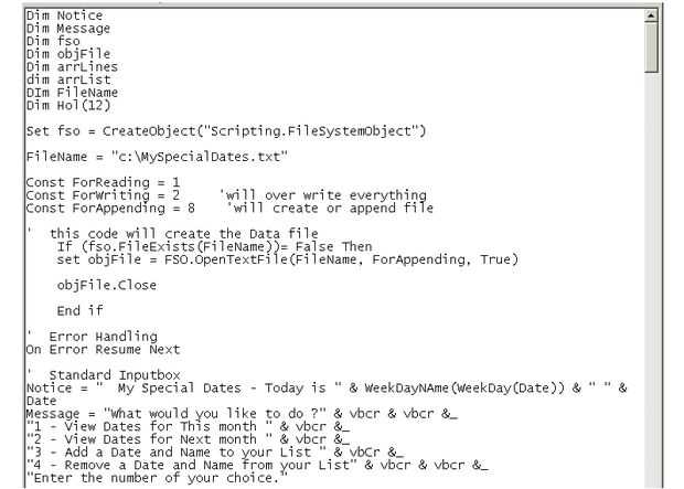 MsgBox "No hay ninguna fecha en" & MonthName(Question) & "",,"días especiales"