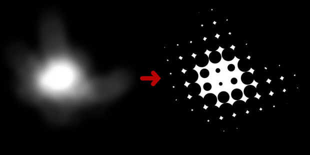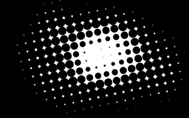 Otro patrón que se ve muy bien son los puntos que hace que se vea como arte pop. Por lo tanto, creas una capa negra y pintura un poco de blanco en el centro con un cepillo muy suave y poca opacidad. No debe de ser exacta. Entonces utilice el efecto que se llama "Halbtonraster" en alemán, no pude encontrar el nombre inglés para él, lo siento. Es el efecto que transforma la capa de puntos blanco y negro, como en la foto. También puede utilizar el patrón debajo de este texto. Entonces puede cambia la opacidad a alrededor del 10% y cambiar el modo en «diferencia».
