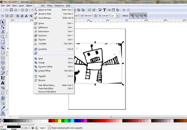 Ahora necesita "rompen" la gráfica de vectores por lo que se puede editar. A diferencia de los gráficos JPG que se definen por filas de diferentes puntos de color llamados píxeles, gráficos vectoriales se componen de líneas y formas (también conocido como vectores, por lo tanto el nombre). Para volver a la metáfora del papel de construcción, gráficos vectoriales son como collages de papel construcción automatizada en la que puede mover de pieza a pieza y editar individualmente, incluso cambiando la forma de borde, color de borde y color de relleno de cada forma.