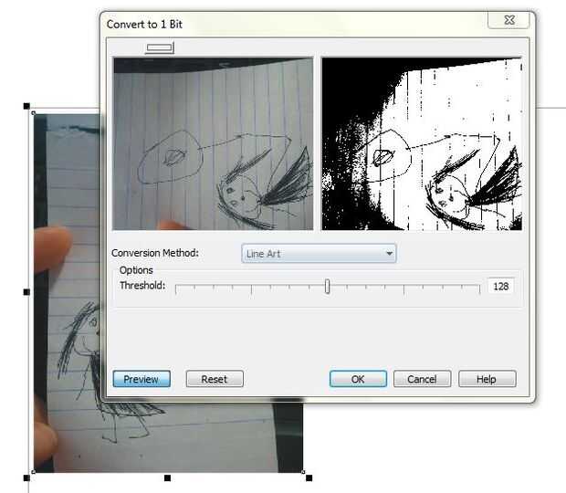 Dentro de este menú son opciones para el "umbral" también conocido como "contraste" de la conversión blanco y negro. Creo que la conversión de "Line Art" (como su nombre indica) produce la mejor representación del vector del arte de línea.