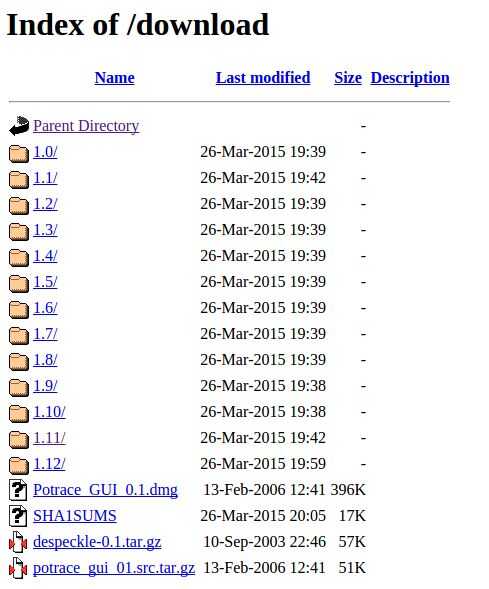 Si por cualquier motivo, no se puede ejecutar el programa en su computadora, todavía puede descargar versiones anteriores de la aplicación aquí: http://potrace.sourceforge.net/download/. Por ejemplo, mi Mac 10.6.8 está poniendo viejo y no podría lanzar versión 1.12, por lo que he instalado la versión 1.11 que funciona bien.