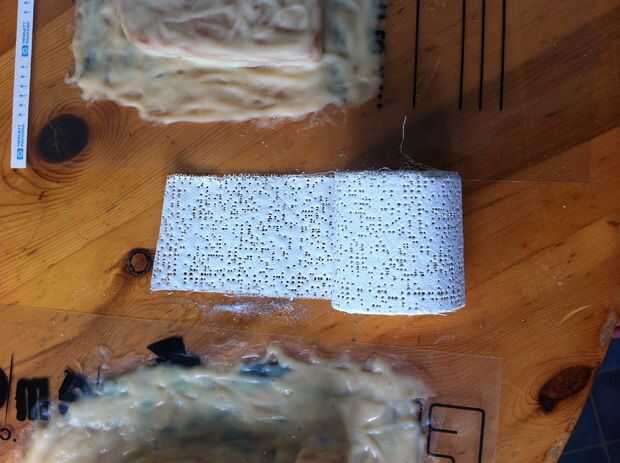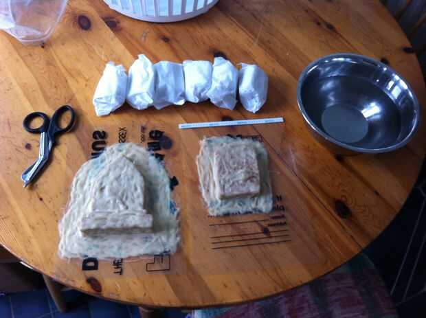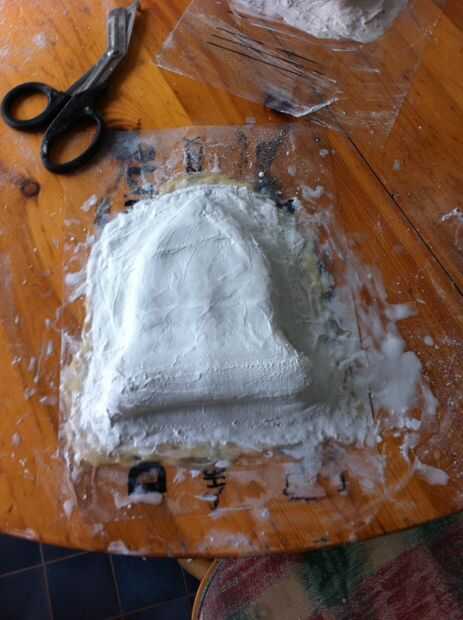 Tome una tira de rok mod sumerja en el tazón de fuente de agua quitar y mientras lo sujeta por el masaje del tazón de fuente para trabajar el agua en el yeso en el vendaje, luego coloque sobre el molde de látex y nuevo masaje, puso tus franjas horizontales para comenzar con y verticales y alternativos hasta los vendajes se utilizan para arriba , asegúrese de dejar suficiente alrededor de los bordes alrededor de 3cm debería ser suficiente.