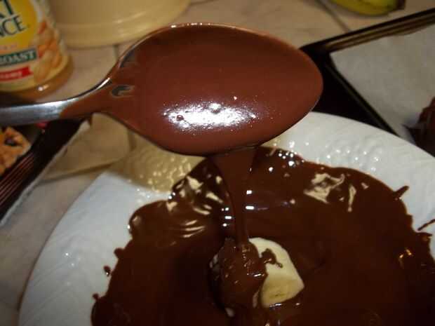 Coloque una rebanada de plátano en el tazón de fuente de chocolate a su lado. Verter el chocolate sobre la rebanada de plátano hasta que estén cubiertas.  Deslice la horquilla debajo de la rebanada de plátano y transferencia hacia el papel para hornear, poner en un lado del corte. De esta manera sabes que el lado cortado tocar el pergamino está totalmente cubierto.  Inspeccione su plátano y su tenedor a cucharada más del chocolate en cualquier espacio que te has perdido.