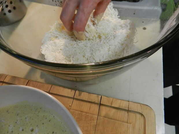 ingredientes:3/4 taza de harina, dividido1 1/2 cucharadita de polvo de hornear2/3 taza de cerveza1 huevo1 1/2 tazas de coco ralladocamarón crudo, cola en 2 docenascanola u otros aceite vegetal suave, de freírIndicaciones:En un tazón mediano, mezcle 1
