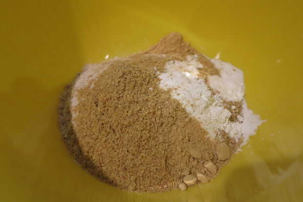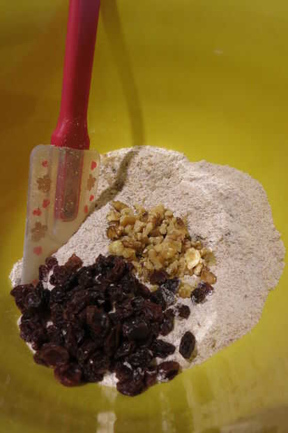 Mida su lino harina y tierra por spooning en la cuchara de medición en lugar de recoger hacia arriba. Volcar todo en una ensaladera con el resto de los ingredientes secos. Mezcla todo bien y luego añadir las nueces y frutos secos (en mi caso, las nueces y las pasas de uva).