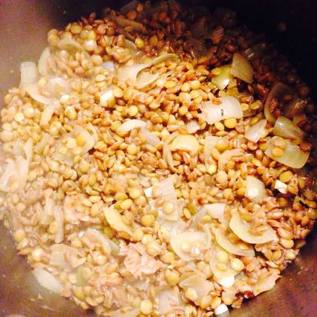 Se combinan lentejas, farro, caldo, cebolla y ajo. Cocinar a fuego medio hasta que cebolla se transparente.