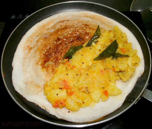 Puse un par de cucharadas del masala de relleno sobre una mitad del dosa y extendió hacia el borde.