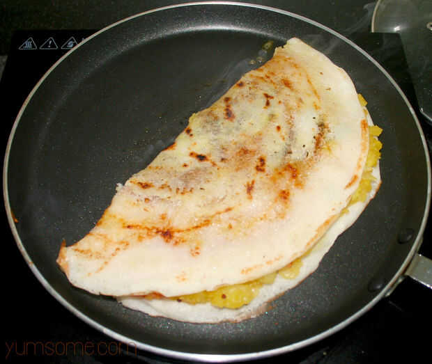 Plegar la otra mitad del dosa para que cubra el relleno. Presione hacia abajo y alisar con la espátula y cocinar durante un par de minutos.