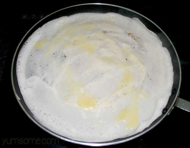 Verter un pequeño cucharón de dosa la masa en el centro de la sartén y luego incline la sartén para que la pasta cubra la base. O usted podría suavizar la masa hacia el borde con el dorso de una cuchara. Puede Agregar un poco más masa para rellenar los agujeros ni huecos.
