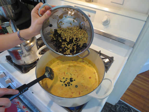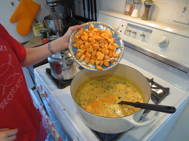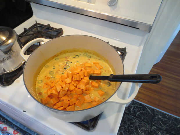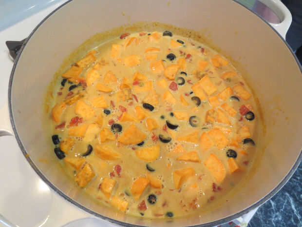 Una vez que la mezcla ha empezado a burbujear, agregar los demás ingredientes: camotes, lentejas y aceitunas.