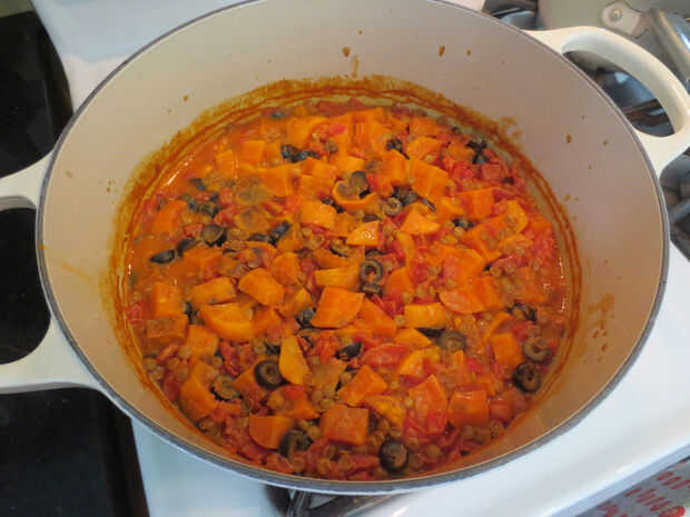 esto es un giro fresco y simple en la cocina con una base de tomate, lentejas y especias marroquíes.  En esta versión vegetariana, calabaza rellena el papel de la carne.  Es un guiso abundante, sano y picante para proporcionar calor y energía en invi