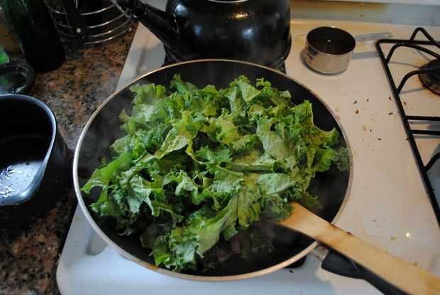Paso 4: Saltear el ajo, la cebolla y la col rizada