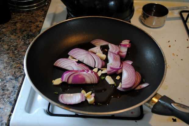 Siguiente saltear la cebolla y el ajo. Puede utilizar aceite, utilicé salsa de soja de bragg. Una vez que las cebollas son agradables y cocido añadir la col y cocine hasta que la col rizada es suave.