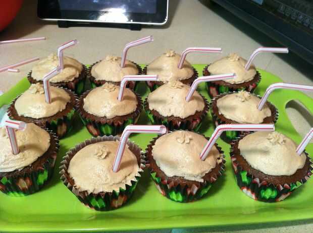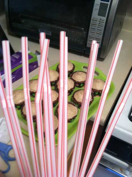Pegar los tubitos en los cupcakes apagado a un lado. Si haces cupcakes jumbos, utilice dos pajas y poner uno a cada lado. (Estamos casi listos!!!!)