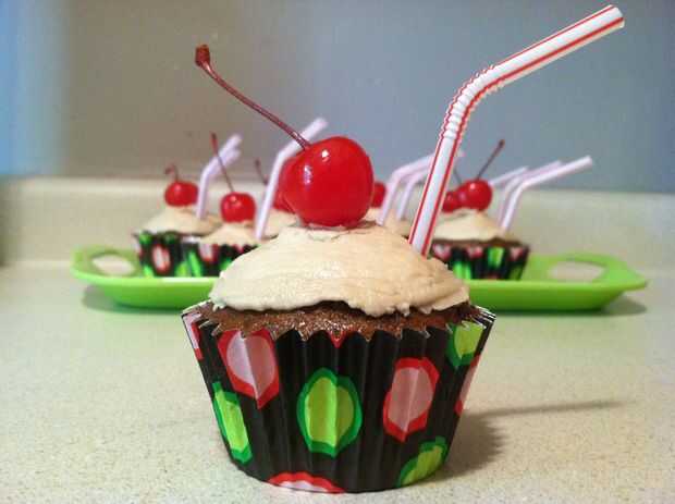Ahora toma tus Cerezas secas y coloque uno sobre cada cupcake en la masa de glaseado. Y listo! Tienes sus magdalenas de flotador de la cerveza de raíz. Adorable y muy muy sabrosa.