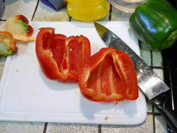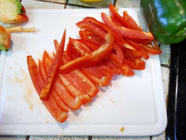 Corte el tallo de uno de los pimientos y quitar las semillas. Cortar el pimiento en tiras de sobre 1/4 de pulgada de espesor. Repita con los otros dos pimientos.