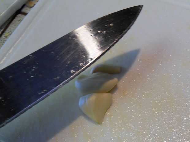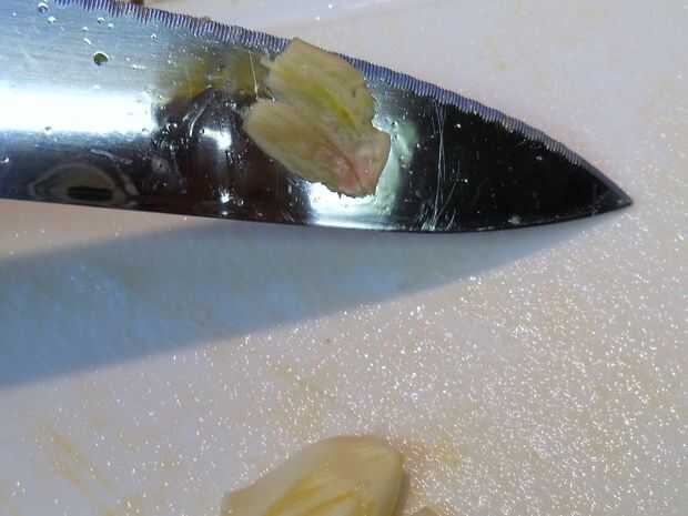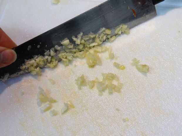 Utilice una prensa de ajo para machacar el ajo. Si no tienes una prensa, cortar el ajo en pedazos pequeños. Empezar por retirar tanto la piel como sea posible. Pone los dientes planos y con el lado plano de la navaja, presione firmemente hacia abajo en el ajo, romper entre el cuchillo y tabla para cortar. Ahora debe poder quitar fácilmente el resto de la piel. Trocear el ajo machacado en trozos pequeños.