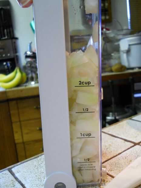 Cortar la cebolla en cubos pequeños. Porque mis ojos son muy sensibles a la cebolla, yo uso un picador de vegetal para cortar en trozos pequeños. La cebolla que he usado hace aproximadamente 2 1/2 tazas de dados.