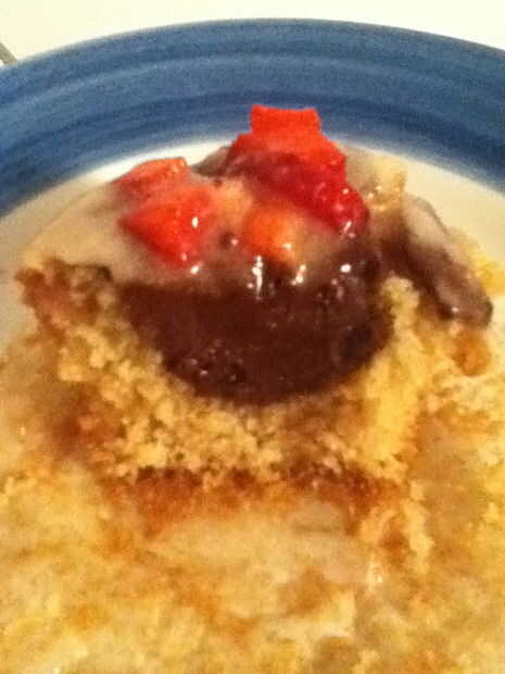 VARIACIÓN dos: Vainilla cupcake, chocolate centro, plátano glaseado con fresas en la parte superior. Utilicé Esta receta para los cupcakes de vainilla