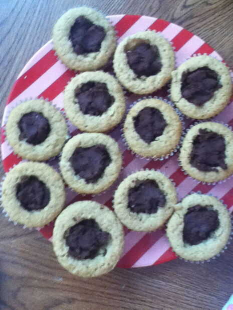 Horneados los cupcakes según la receta de plátano y un chisme de holer de la Magdalena para quitar el centro. Podría también utilizar un cuchillo de cocina para esto o simplemente presione con su pulgar.