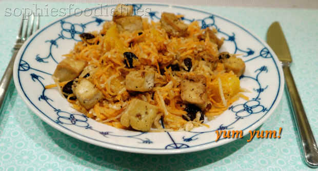 Esta noche, inventé esta ensalada de bonita con rábano negro rallado, zanahorias, pasas grandes remojadas y mucho más... Hace un aderezo de vinagre balsámico simple y sirve con pedacitos de tofu frito. Fue una super deliciosa ensalada que también era temporada! Ñam ñam ñam! Era muy sabroso! :)