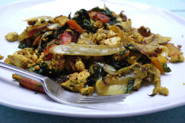 Esta mañana, que quería hacer un scramble de tofu delicioso desayuno! Tuve que usar unas verduras de mi nevera! Por eso yo llamo a esto un scramble de tofu de nevera! He añadido unas especias de mi despensa y para mantenerlo veganas y sin gluten, he añadido un poco de levadura nutricional para un sabor a queso!