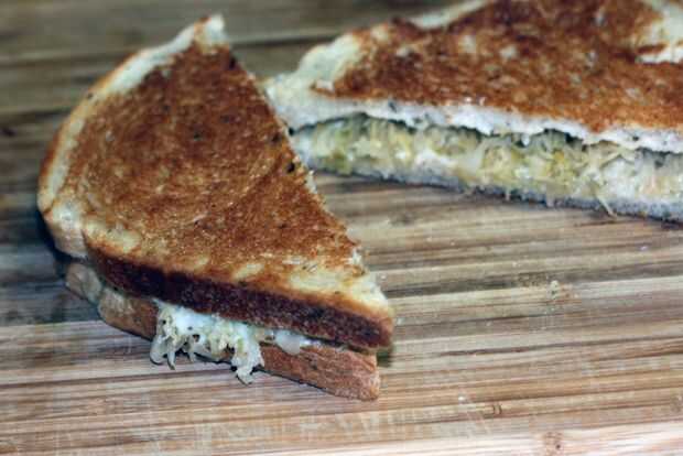 La razón principal de que hacer esta receta de mozzarella es para nuestro sándwich de mozzarella, chucrut y pan casero tostado con aceite de coco.