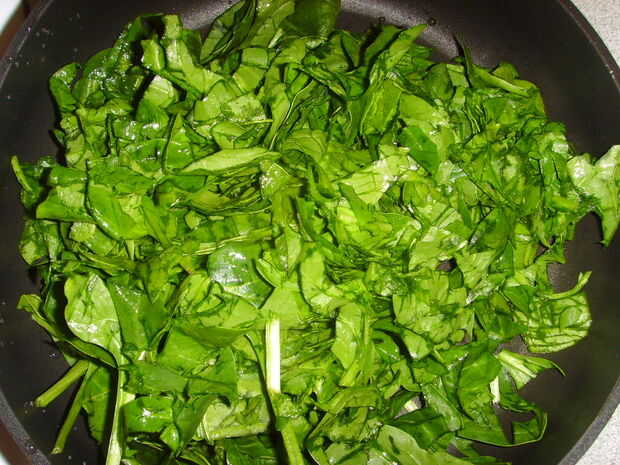 Picar la espinaca como se muestra en la primera foto, no tiene que ser perfecto. Cocinar en una sartén con el ajo picado y el vino (o sustituto del agua) para 3 o 4 minutos hasta que es suave.