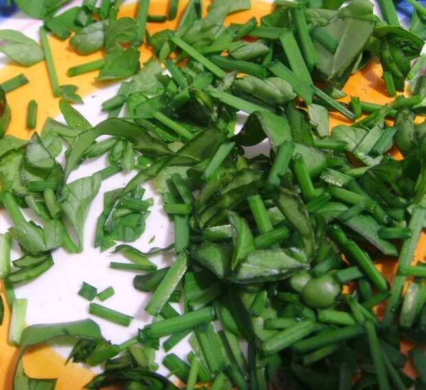 Picar las hierbas, como se muestra en la foto. No tienes que usar fresco, apenas llego a tener un mini jardín de hierbas. Definitivamente puede usar secas.