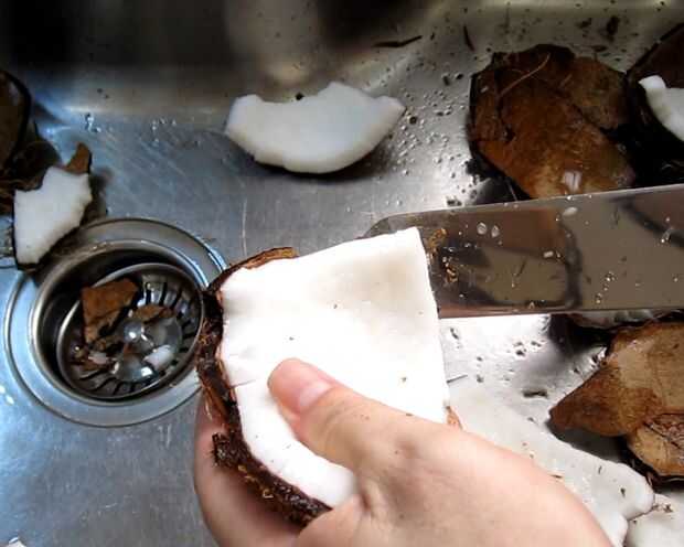 Nota: Retirar la piel de la pulpa de coco si quiere utilizar la pulpa para hacer harina de coco más adelante.