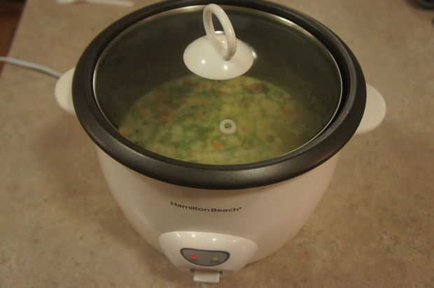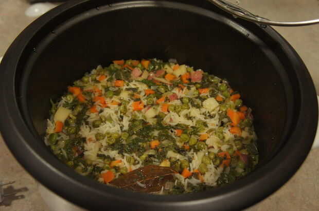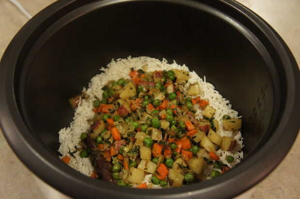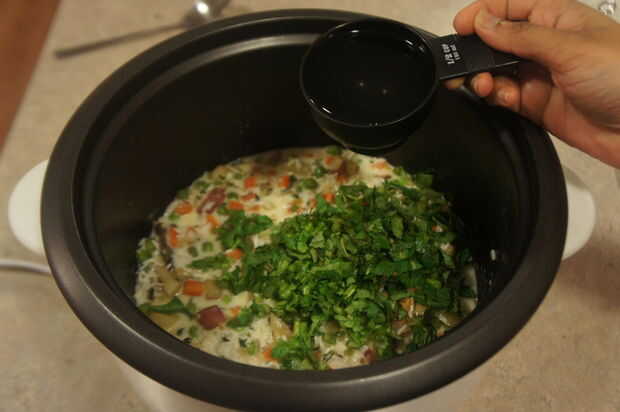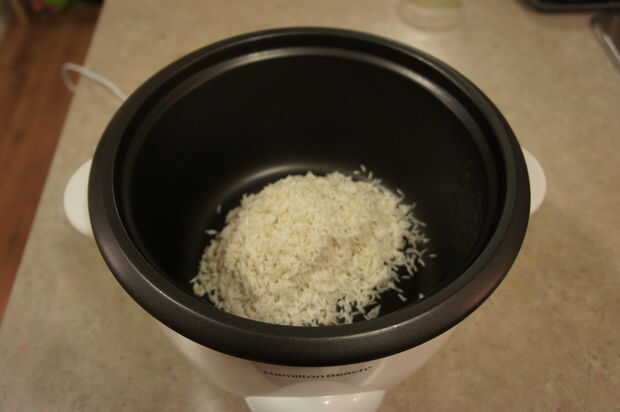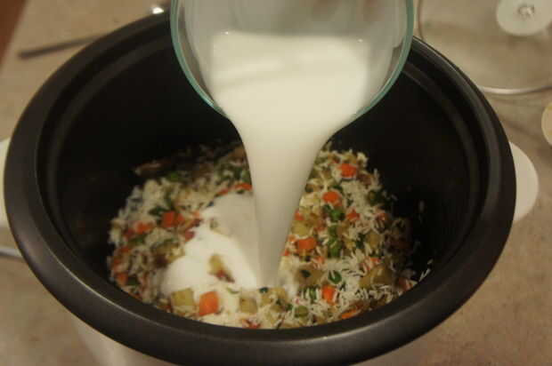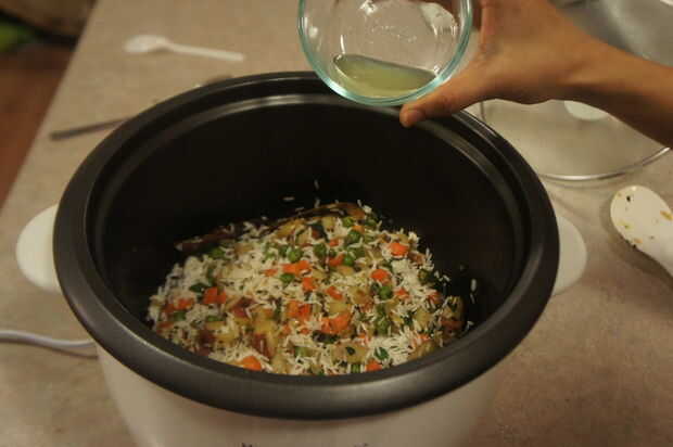 1) en una olla eléctrica, añadir el arroz remojado y escurrido.