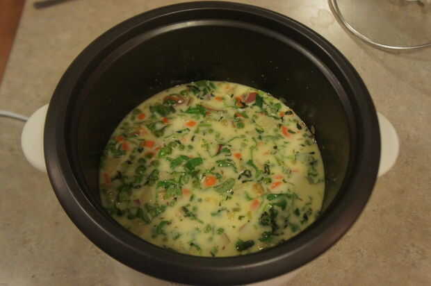 2) a la que añadir verduras salteadas, jugo de limón, leche de coco, restante de menta y hojas de cilantro y mezcla.