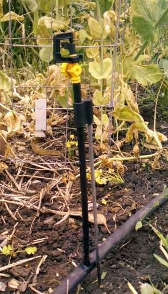 Una configuración tiene aspersores de 3 o 4 tomas y clavijas de apoyo tal vez. Esto es bueno para camas con cortos numerosos cultivos como zanahoria, fresas o incluso los espárragos.