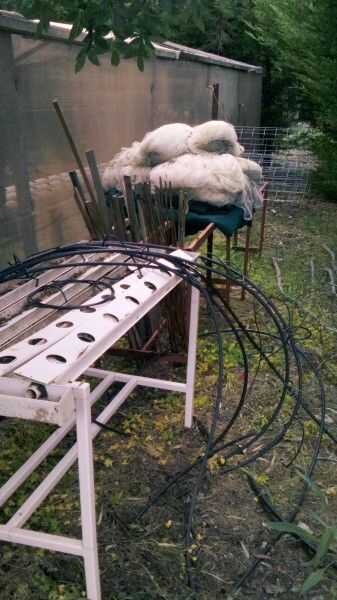 Las líneas de aspersión son grandes, difíciles de manejar y tienden a enredarse. Cuando pueda los ponen encima de una rejilla que he creado para el almacenamiento de otras infraestructuras jardín temporal le gusta redes de ave, tomate tubos y estacas de jardín.