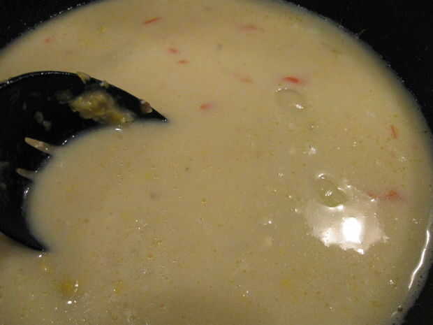 Gusto su brebaje.  Añadir sal y pimienta si desea.  Cortar algunas cebollas verdes con tijeras y espolvorear.  Servir caliente o frío y puede alimentar a por lo menos 4-6 personas.