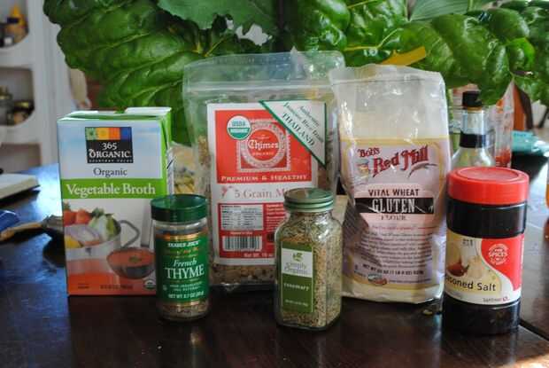 Para esto se necesita lo siguiente 2 tazas de gluten de trigo vital 2 tazas de caldo de verduras 3 cucharadas de Romero 3 cucharadas de tomillo sal 1 cucharada sazonado (o ajo en polvo, cebolla en polvo etc.) 1 bolsa de arroz salvaje (aproximadamente 2 tazas)