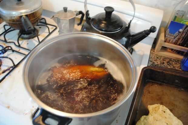 a continuación iniciar un caldo de salsa de soja y miel (2 cucharadas de cada uno) en alrededor de 6 tazas de agua y hervir.