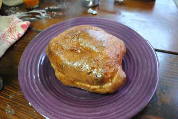 Siguiente que desea hornear el pan. En este punto podría congelarlo y esperar para hornearlo. De lo contrario le llevará aproximadamente una hora para hornear el pan. Rociar el pan con aceite de oliva y añadir algunas verduras de raíz alrededor de él si lo desea