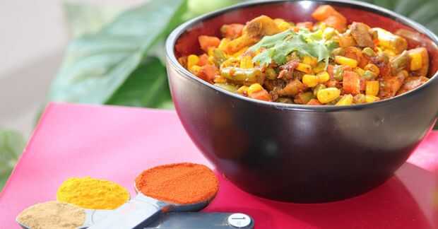 Un experimento con verduras resultada muy bueno. Su sabor picante y dulce a tingle la lengua. Este plato vegano no requiere mucho tiempo y los ingredientes especiales. Usted puede hacer cuando estás de prisa y corriendo para un partido. Mejor servido con arroz blanco llano o pan indio.