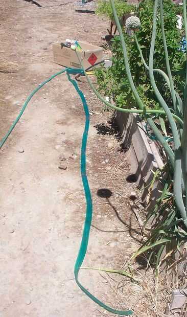 Ahora podemos conectar la manguera de irrigación a la manguera de riego de jardines y extienda la manguera a lo largo de nuestras filas.