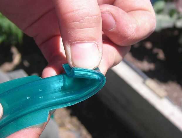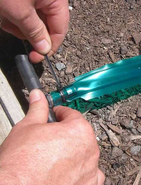 • En el otro extremo de la manguera de remojo, recorte cuidadosamente las alas unos 5cm. Esto es para permitir un mejor sello afianzada con abrazadera sobre la ' t '. Ahora deslice el extremo de la manguera de remojo en la ' t ' común (es un ajuste apretado pero ir, probar el truco del agua caliente si tiene problemas). La manguera de remojo se ejecutará a lo largo de entre sus filas de veggie. Asegúrese de que los pequeños agujeros en la manguera de irrigación están apuntando hacia arriba. Uso uno de mi querido cable lazos para asegurar la manguera de remojo en la ' t ' común.