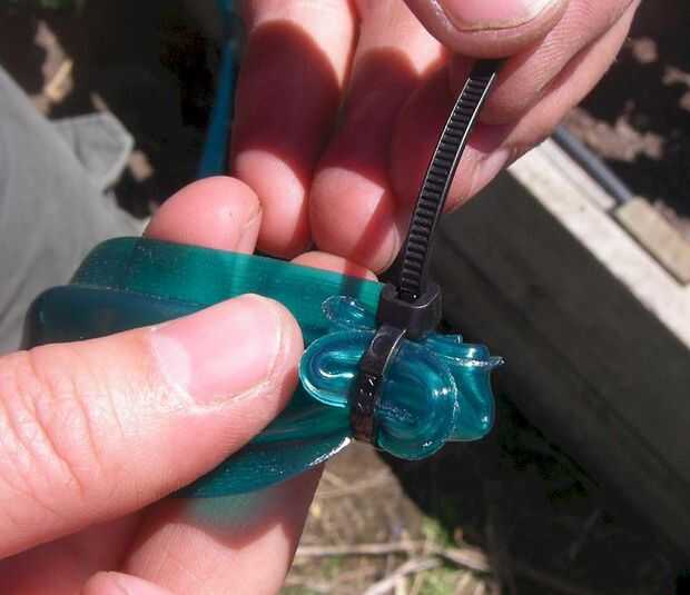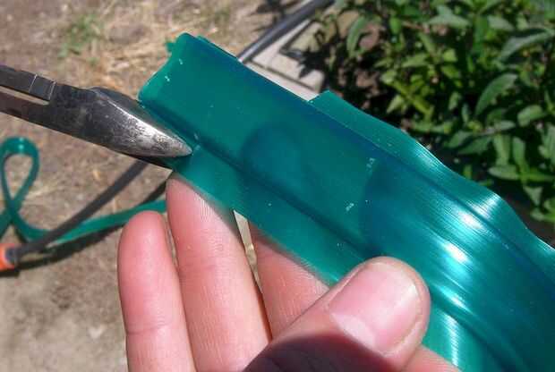 • Es necesario en blanco de un extremo de la manguera de remojo (este es el otro extremo de la manguera de riego). La manguera de remojo tenía alas a lo largo de su longitud (estos son para mantener la manguera sobre cuándo en uso). Con cuidado recorte las alas en un extremo de unos 10cm, doble la manguera hacia atrás sobre sí mismo hasta la mitad a lo largo de la zona recortada. Doble la manguera sobre sí mismo otra vez y poner un lazo de cable alrededor de la manguera para crear un extremo de la cubierta.