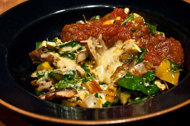 Este es un desayuno que he estado haciendo un par de años, encendido y apagado. Hay no hay reglas duras y rápidas en los ingredientes. Lo que está en la nevera funciona. Un poco grasa, una taza o menos de verduras picadas, un puñado de verdes, un huevo, condimentos y queso. Me gusta comer con salsa, pero que es totalmente opcional. Tiene proteína para mantenerme va a lo largo de la mañana, buenas verduras carbohidratos y fibra, algo de grasa para mantenerme satisfecho y un montón de sabor.