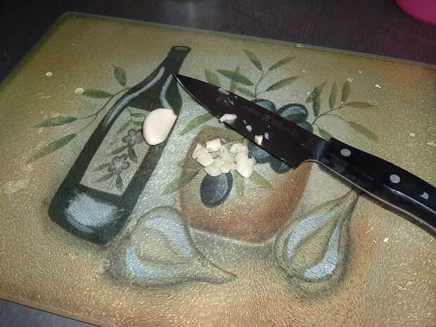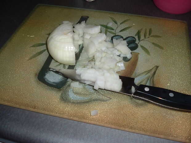 Precalentar el horno a 350 grados y Precaliente una olla mediana a fuego medio en el quemador. Picar los dientes de ajo y cebolla.