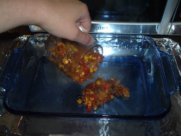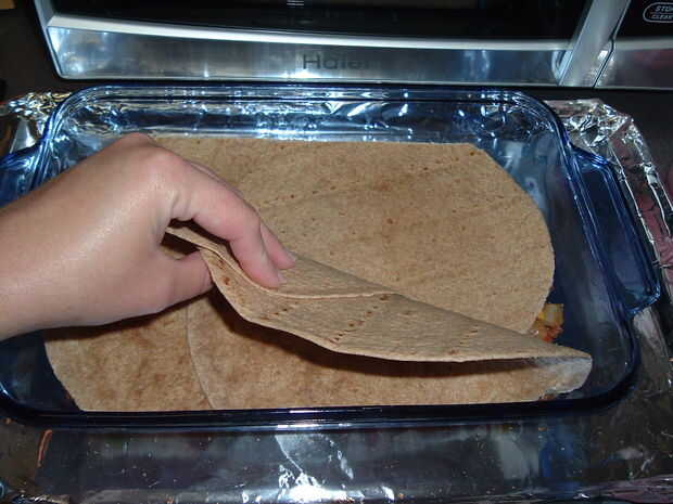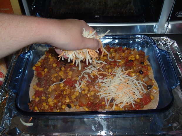 Poner una taza del vegetal / mezcla de "carne" en la parte inferior de la bandeja y extensión hacia fuera. Añadir dos capas de tortillas (usando las piezas de exceso a rellenar los agujeros, si es necesario), dos tazas más de los vegetales / mezcla de la "carne" y un puñado generoso de queso. Continuar estas capas hasta que te quedas sin ingredientes.