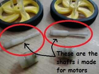 La foto muestra el eje que hice para mis motores. Que tendrás que hacer diferentes tipos de eje según el diseño de sus motores y ruedas. Las ruedas que usé tenían un agujero cuadrado. Por lo tanto, se me ocurrió este diseño.